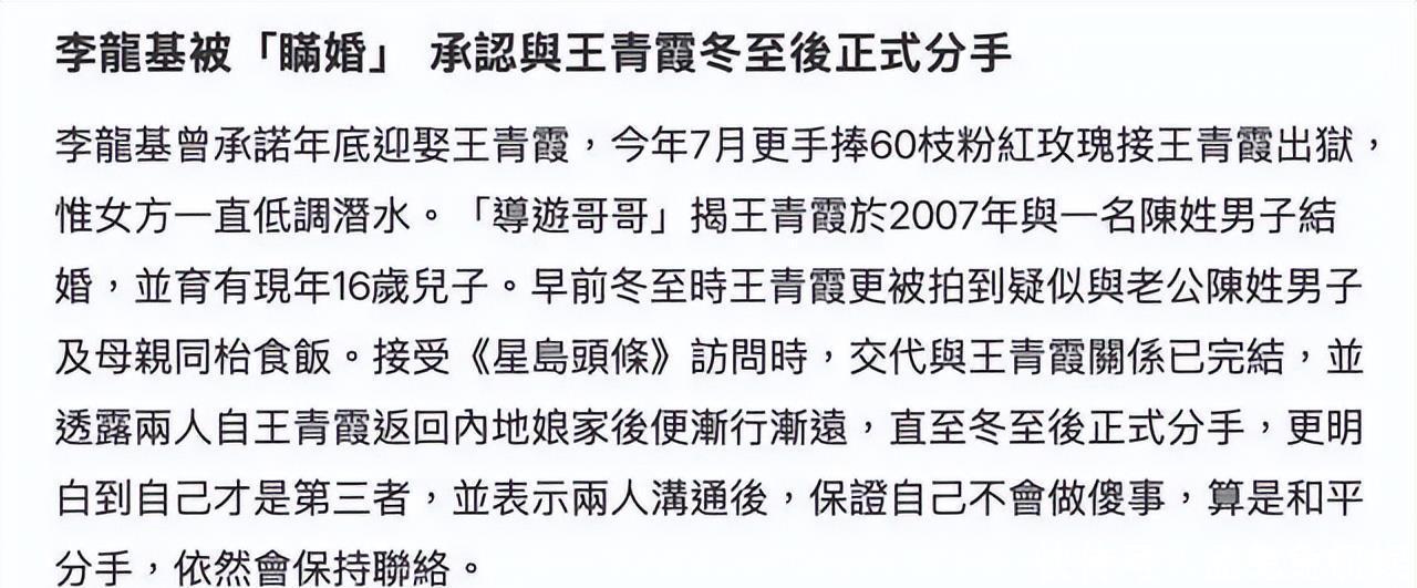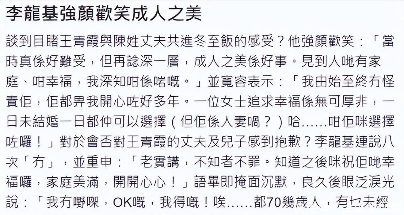 不过离谱的是,就在12月份,竟然拍到了王青霞和陌生男子还有一位中老年人一起用餐,看起来关系匪浅。港媒随后爆料,该男子竟然是是王青霞在内地已经登记结婚的合法丈夫,并且两个人还有一个16岁的儿子。他们也共同长期生活许久,王青霞也只是独自在香港陪伴李龙基。
